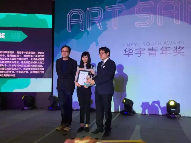 策展人孫冬冬、華宇青年獎總策劃人趙屹松為藝術家高倩彤頒發(fā)評委會特別獎