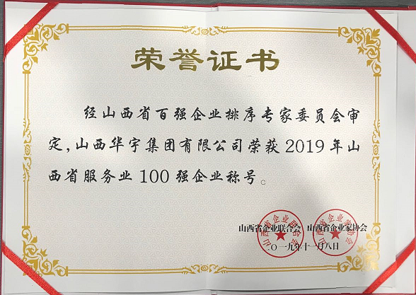 山西華宇集團(tuán)有限公司榮獲“2019年山西省企業(yè)100強(qiáng)”、“服務(wù)業(yè)100強(qiáng)”殊榮。